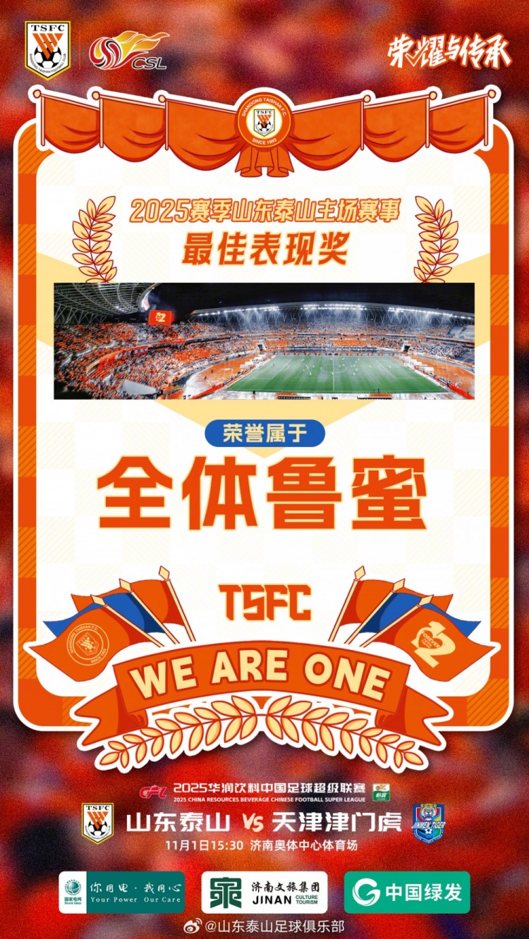 2025-11-01 00:56:00賽季主場(chǎng)收官戰(zhàn)!泰山隊(duì)發(fā)賽前海報(bào):最佳表現(xiàn)獎(jiǎng)屬于全體魯蜜