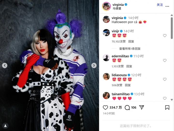 10月30日訊 萬(wàn)圣節(jié)即將到來(lái),維尼修斯女友弗吉尼亞在社媒上分享了自己與維尼修斯的萬(wàn)圣節(jié)裝扮。
