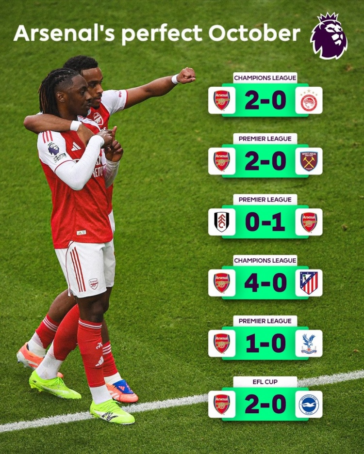2025-10-31 01:21:24英超列阿森納本月戰(zhàn)績:首支單月各賽事6連勝且未丟1球的英國球隊(duì)